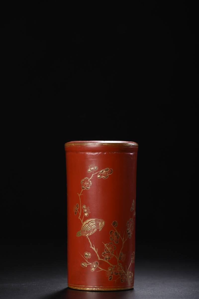 - 蔵友旧蔵出 木胎漆器彫 描真金 花鳥紋 詩詞賦 筆筒 供養品 置物擺件 古賞物 中国古玩 中国古美術品