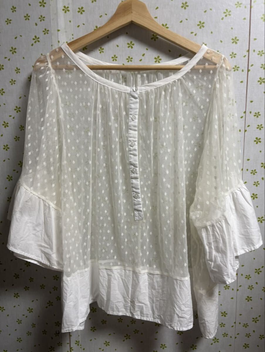 > USED 4Lサイズ シースルー ホワイト ドット柄 五分袖ブラウス ホワイト ブラウス レース 白 トップス カットソー