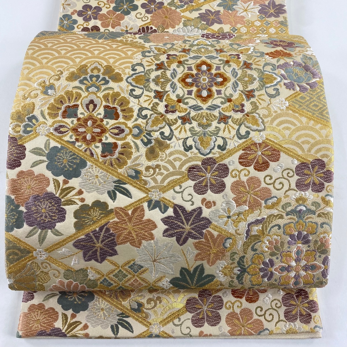 > 袋帯 秀品 華文 草花 金糸 箔 ベージュ 六通 正絹 【中古】