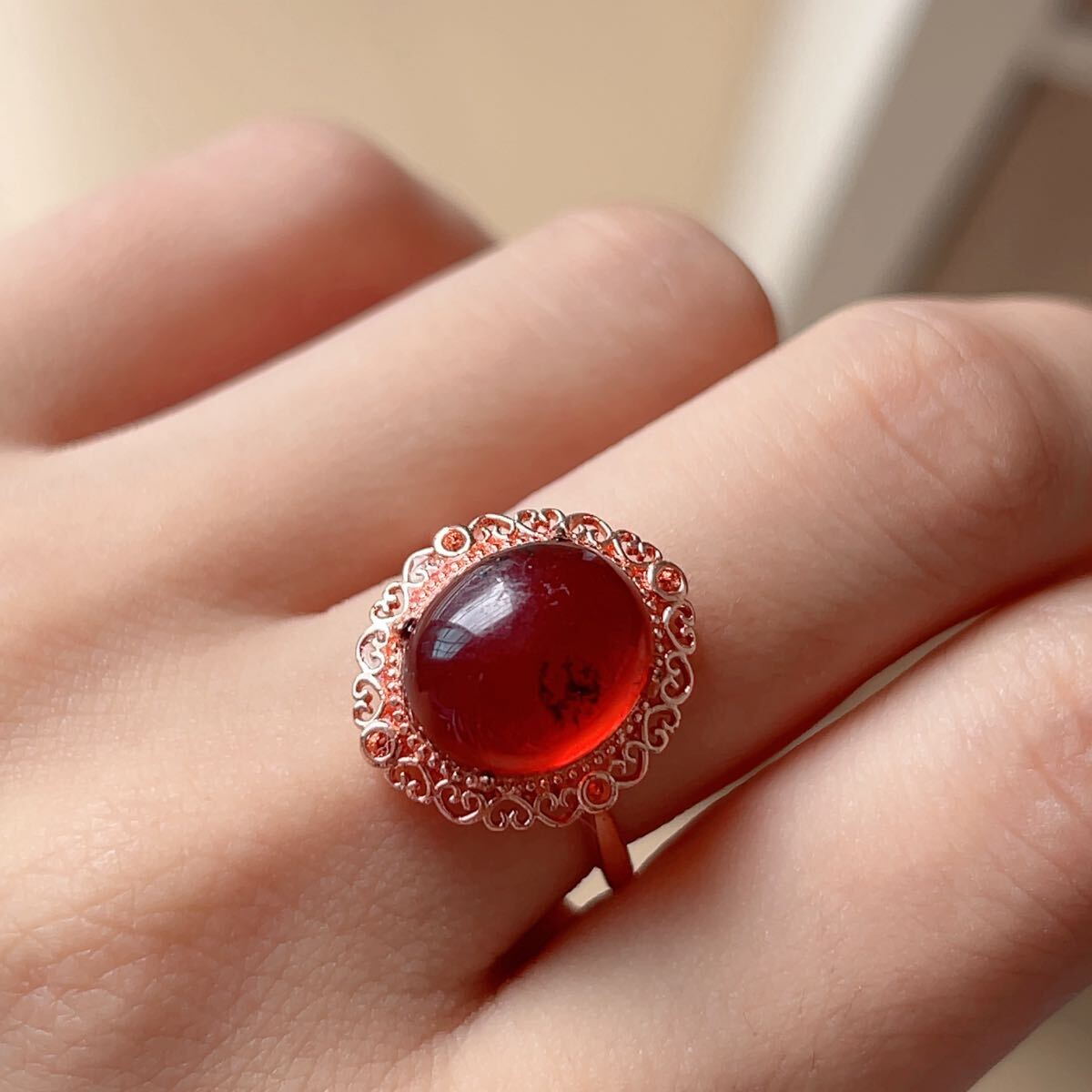 > 訳あり◇ブラッドアンバー(琥珀)◇リング◇指輪◇フリーサイズ◇天然石◇パワーストーン◇巾着袋付き◇プレゼントにも040R988