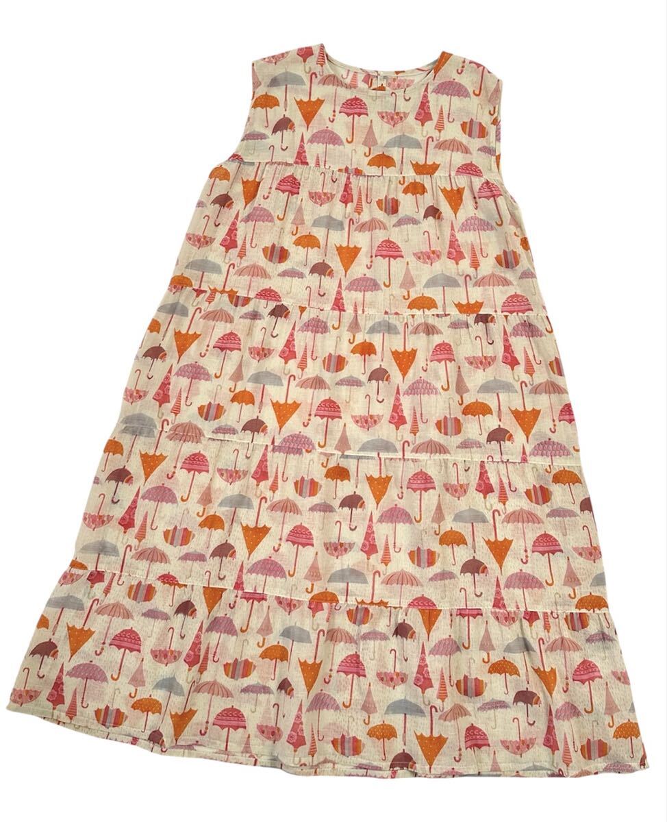 - 新品 タグ付き インド製 ゆったり涼しい 傘プリント 綿麻素材 ノースリーブ ティアード ワンピース M〜Lサイズ
