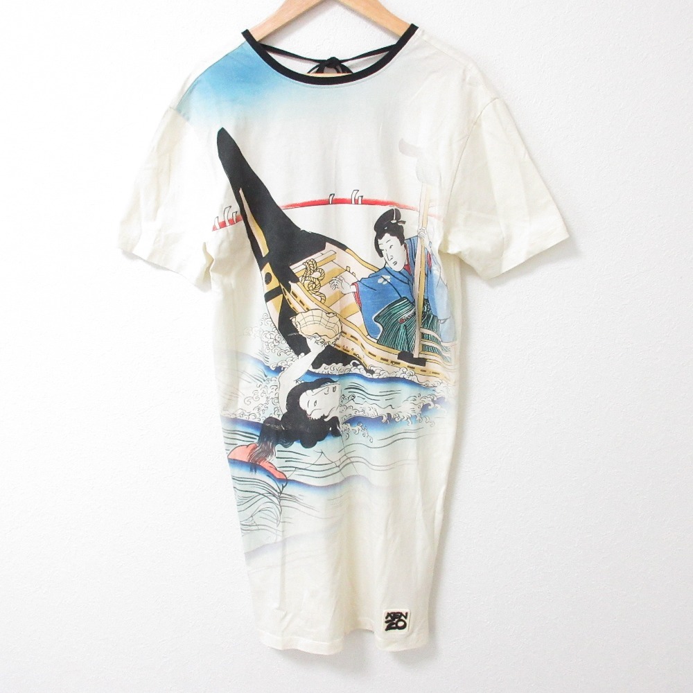 - KENZO ケンゾー 浮世絵プリント バックリボン 半袖 ロングカットソー チュニック ワンピース サイズXS アイボリー