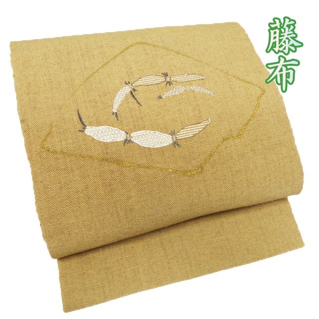 > 特選 夏物 夏帯 名古屋帯 なごや帯 中古 リサイクル 藤皮の繊維 カジュアル 古代布 藤布 刺繍 蓮根の図 黄土色 きもの北條 A1268-11