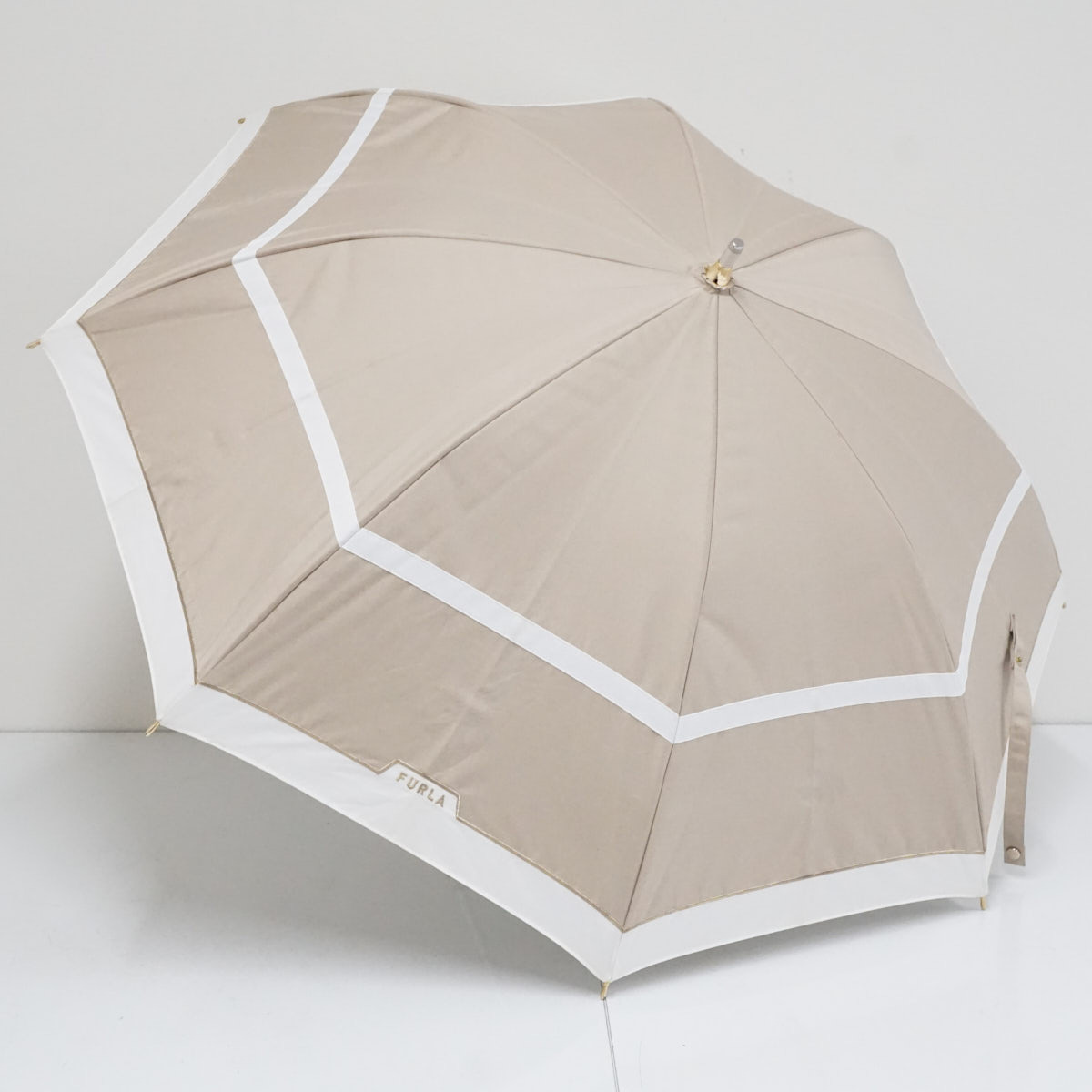 > 晴雨兼用日傘 FURLA フルラ USED品 一級遮光 晴雨兼用 切り継ぎグログラン ベージュxホワイト ロゴ刺繍 UV 遮熱 50cm S3201