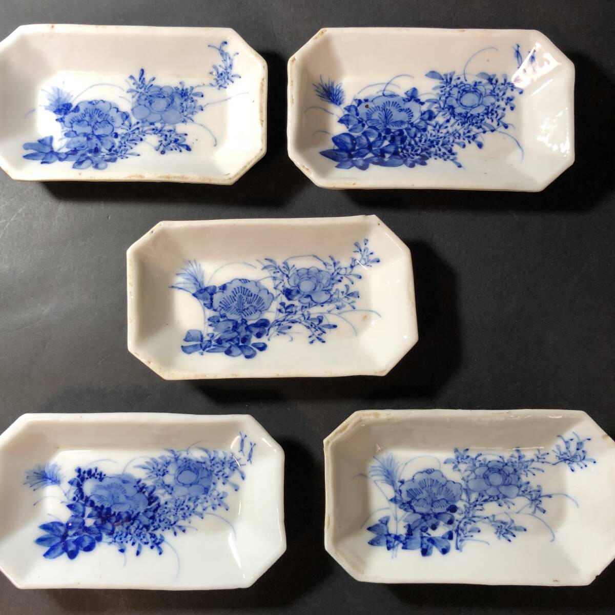 - 瀬戸焼 豆長小皿 小皿 豆皿 染付 草花文様 五客 和骨董 骨董雑貨 テーブルコーディネート