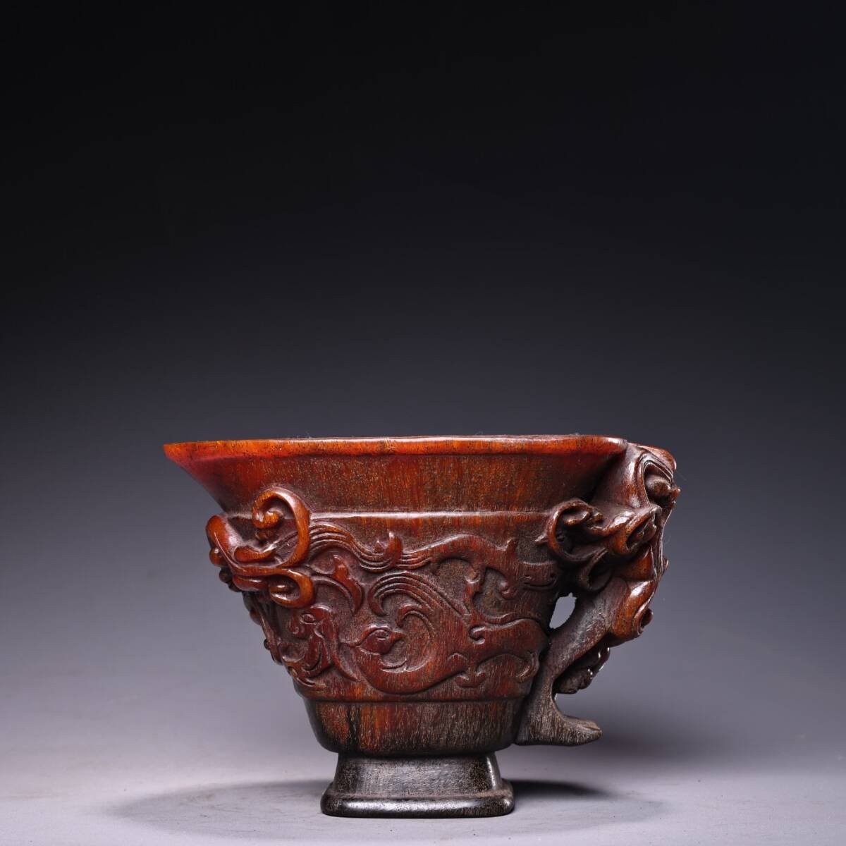 - 【超珍館蔵】角材細密彫 盤龍酒杯 置物 賞物 古賞物 古董品 古美術品 時代物 旧家蔵出 稀少珍蔵品