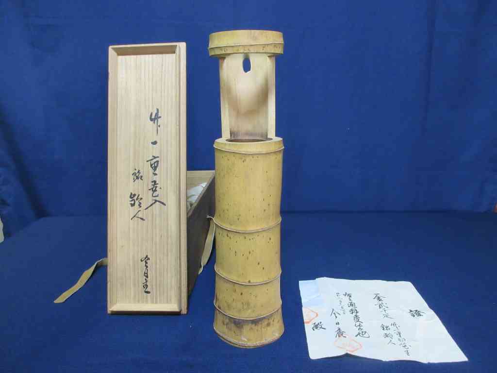 - 朱銘花押有り 竹花入れ 共箱 昭和3年証有り