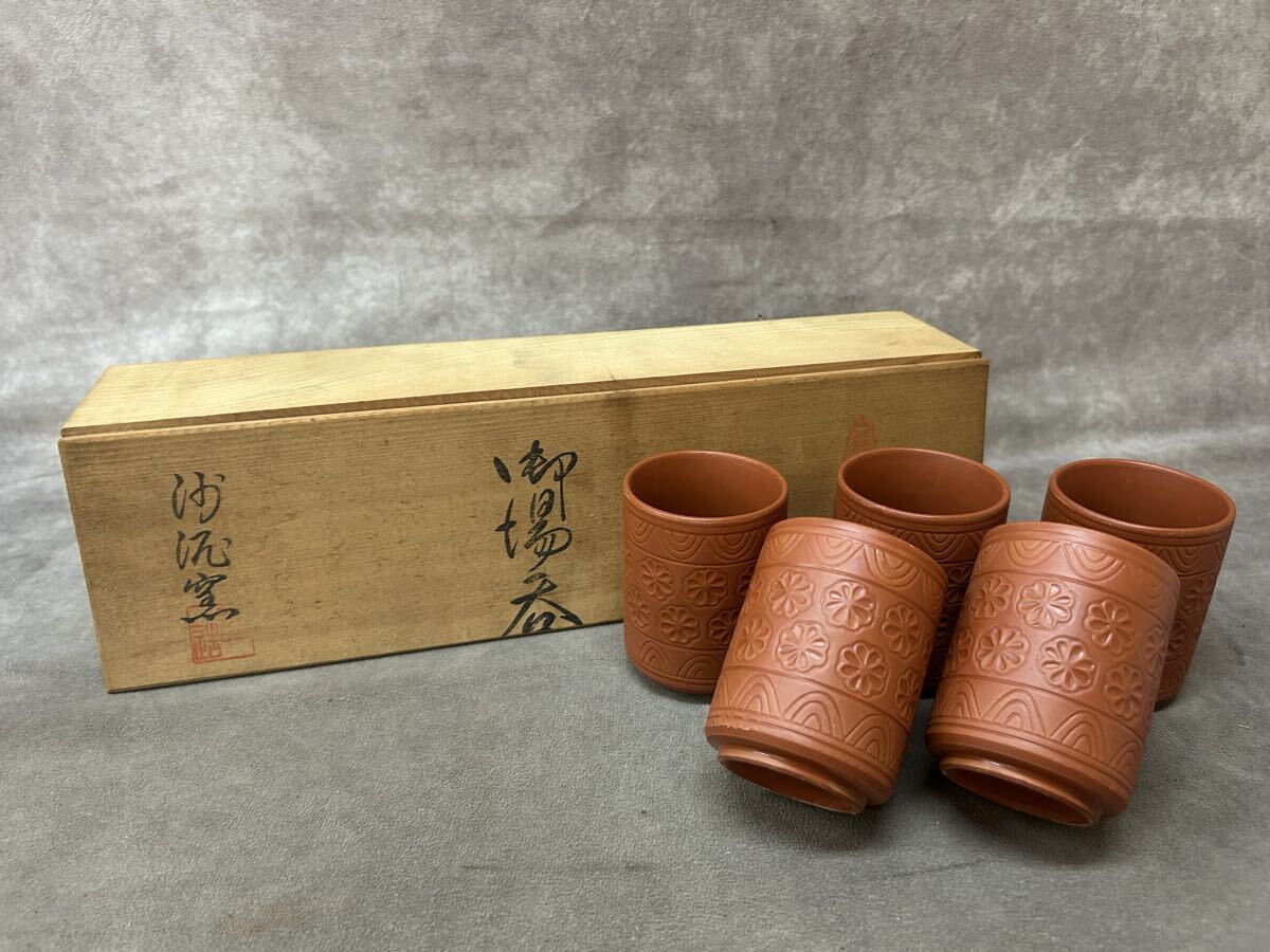 - 未使用 保管品 美濃焼 朱泥 三島花文様 湯呑み 5点セット 箱入