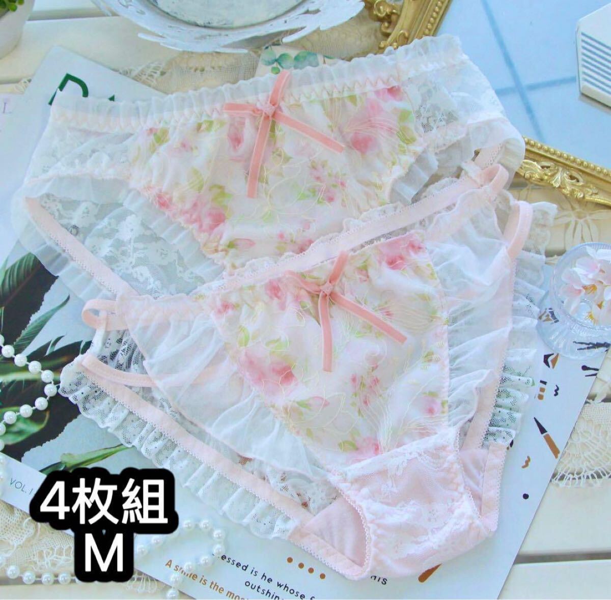 - ★超おすすめ★4枚組M 可愛い女の子フラワーレースショーツ リボン付き 539号