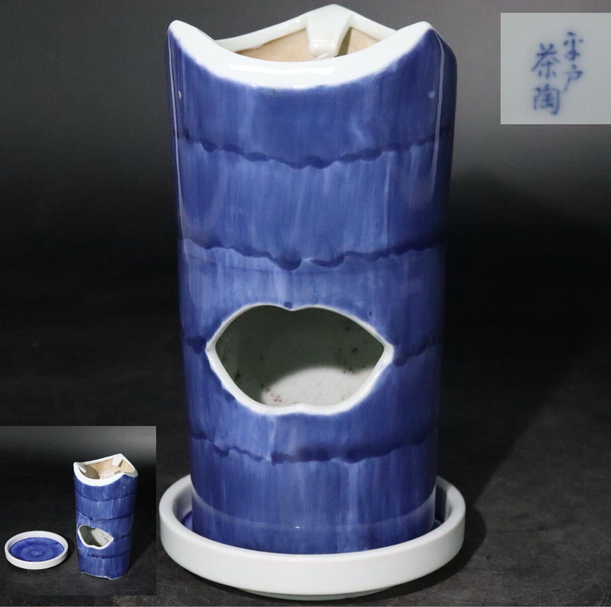 > 「 平戸 茶陶 」 銘 呉須 染付 竹文 涼炉 ・ 涼炉台 / 平戸焼 煎茶道具 茶器 .B1047