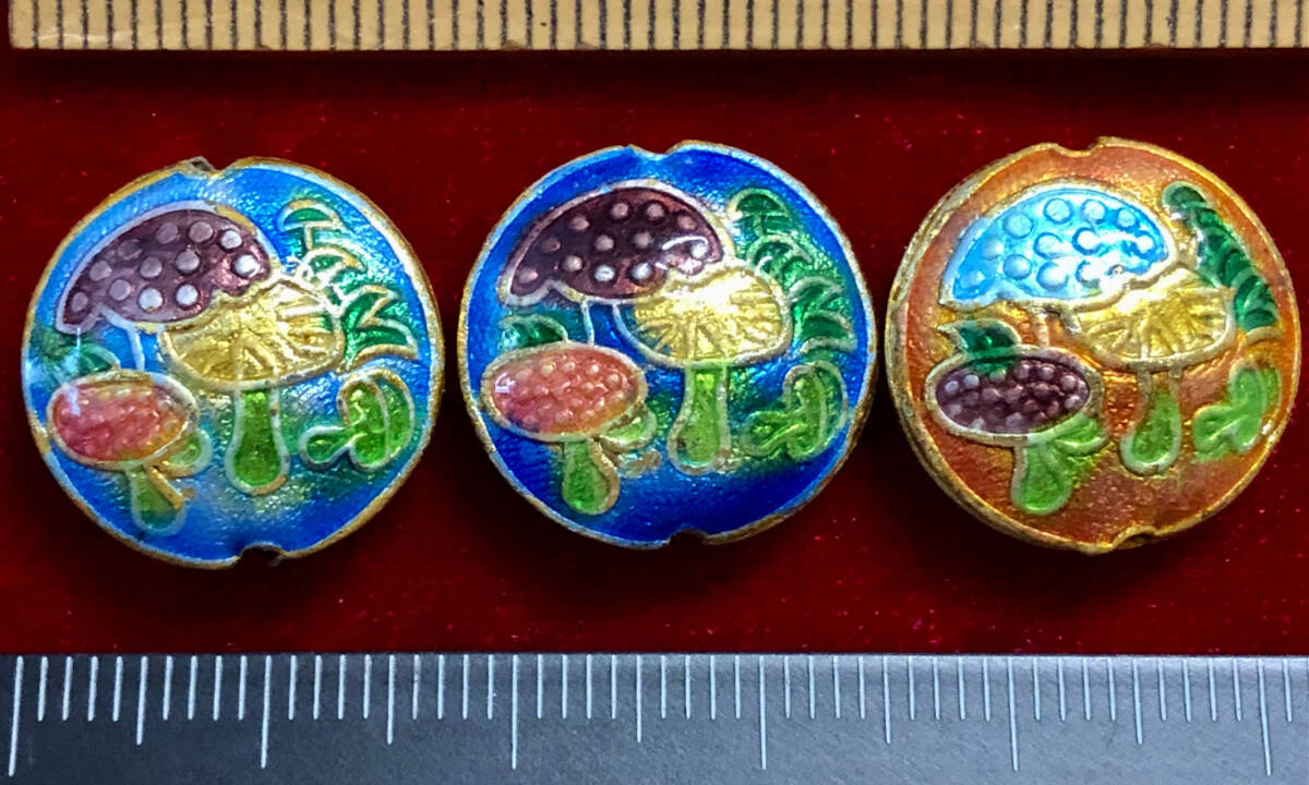 > ¶!¶ 有線七宝焼ワールド - 3色(個)の円盤型玉で1単位b ¶!¶ 約厚7㎜×Φ17㎜円盤型玉 金線に3色釉3色茸類 手作り 手芸 工芸 インテリア