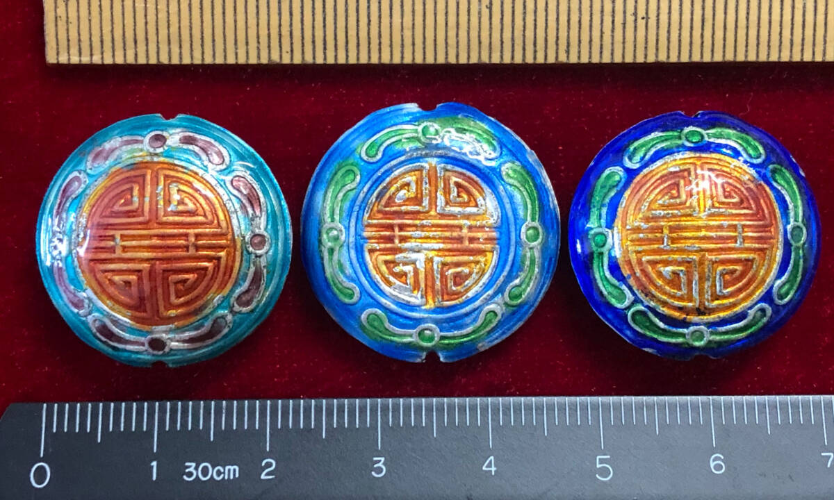 > ¶!¶ 有線七宝焼ワールド - 3色(個)の円盤型玉で1単位 ¶!¶ 約厚9㎜×Φ23㎜ 金線3色釉緑褐祥雲橙色萬壽紋様 手作 手芸 工芸 インテリア