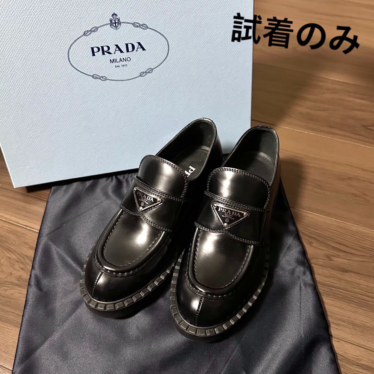 > PRADA プラダ 三角プレート 厚底 チョコレート ブラッシュドレザー ローファー 革靴 スリッポン モカシン 新品級 黒 レーディス シューズ36