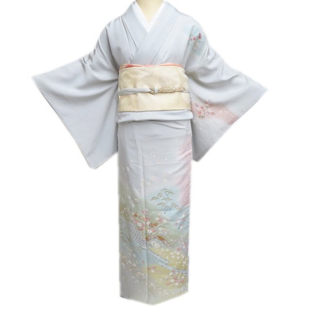 - 訪問着 着物 中古 正絹 袷 フォーマル 金駒刺繍 花の図 片輪車 暈し 白鼠色 多色 金 身丈163cm 裄65.5cm L きもの北條 A1270-6