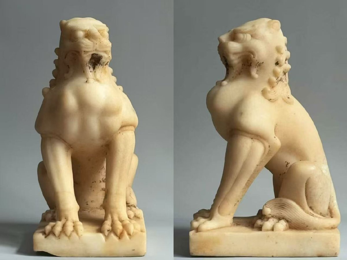 > ■観心・時代旧蔵■B9009南北朝時代 漢白玉雄獅 漢白玉石細密細工★古置物★古賞物★古擺件★ 高さ26cm横幅15.5cm奥行き11.7cm