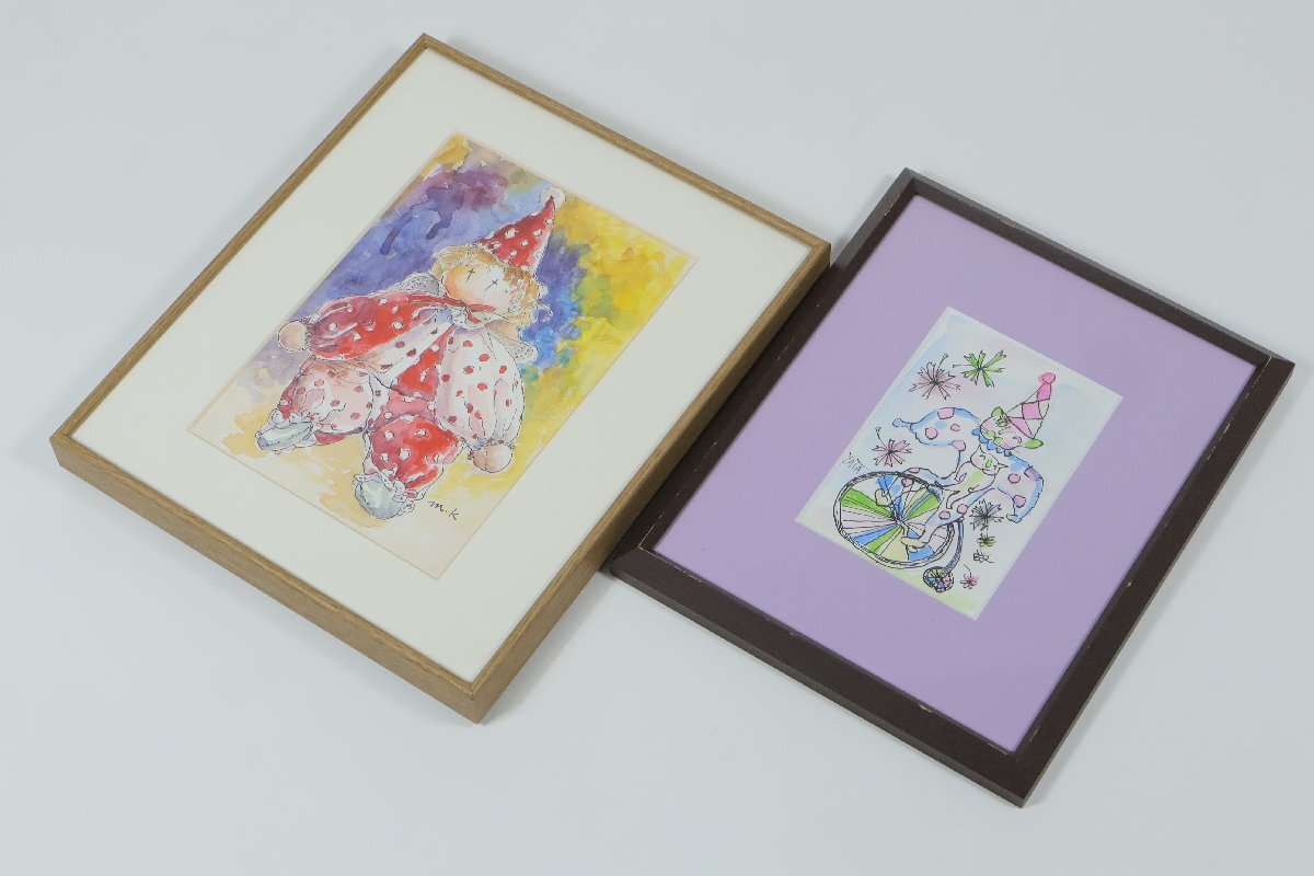 ・水彩画「かわいいお人形」「自転車にのる猫」2点セット 額装品 小品 yata m.k