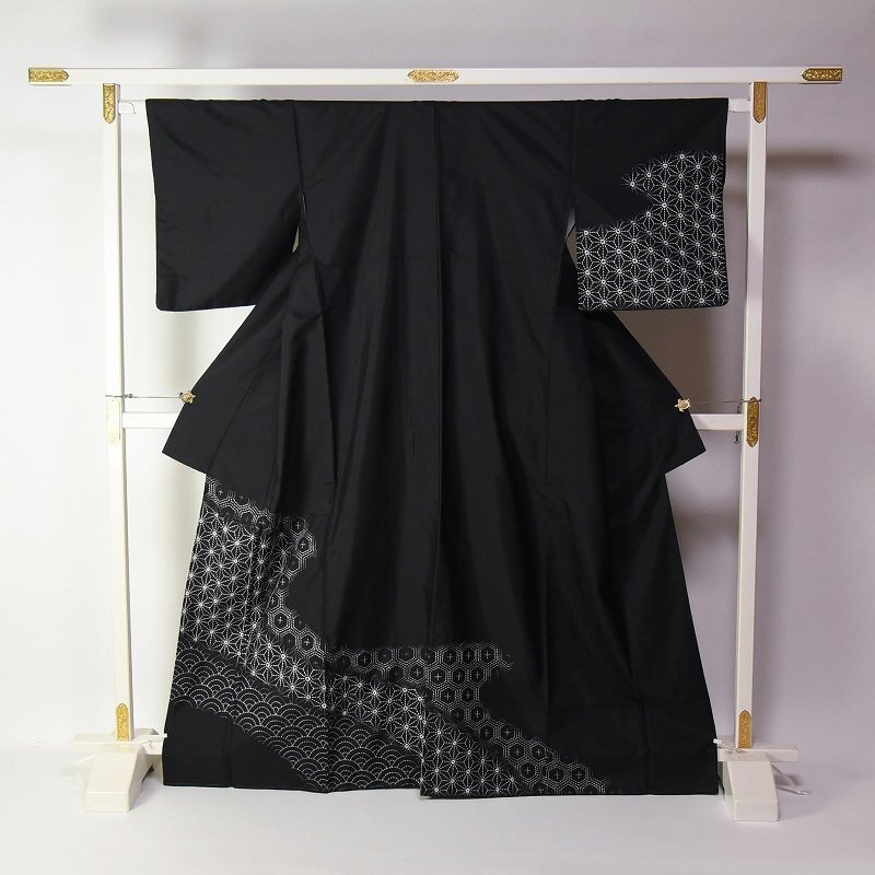 > 【ほりだし堂】 お仕立て済み シャリ感のある紬 刺し子刺繍 麻の葉、青海波 黒色 着物 身丈159cm