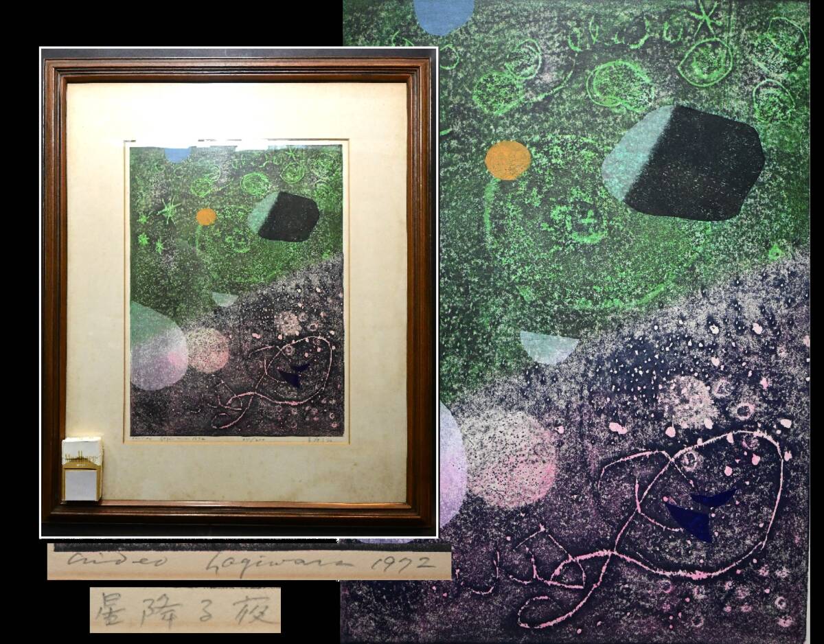 - 真贋保証■萩原英雄■ 木版画『星降る夜』1972年 24/200 直筆サイン 額装 山梨県甲府市生 検:自然 宇宙