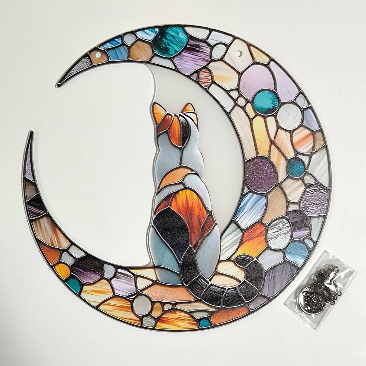 - 【三日月と三毛猫 カラフル】アクリルプレート 飾り サンキャッチャー チェーン付き オブジェ お洒落 壁や窓辺の飾りに◎