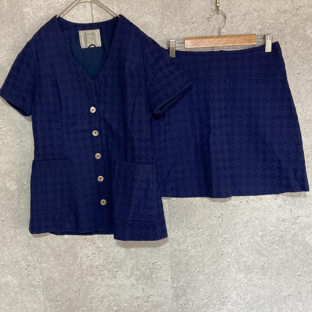 - EMI(one)スカートセットアップ*半袖ジャケット*裏地*Vネック*ミニ丈*青