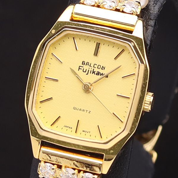 - 稼働 バルコン QZ Fujikawa オクタゴン 石付 パール ゴールド文字盤 レディース腕時計 YSD