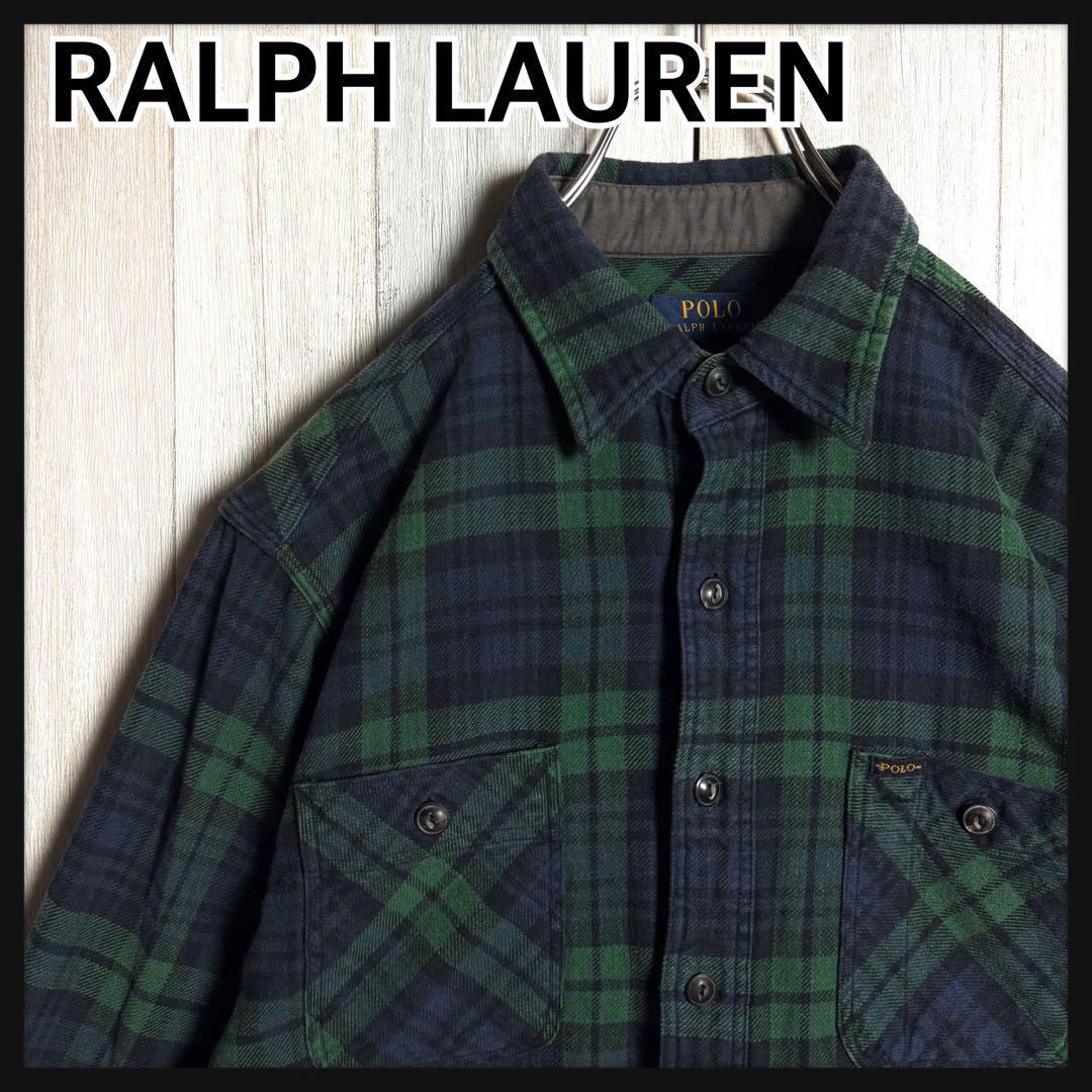 > 【現行・美品】POLO RALPH LAUREN ポロラルフローレン ブラックウォッチ柄 ヘビーネル ワークシャツ グリーン 緑 M 実寸大きめ