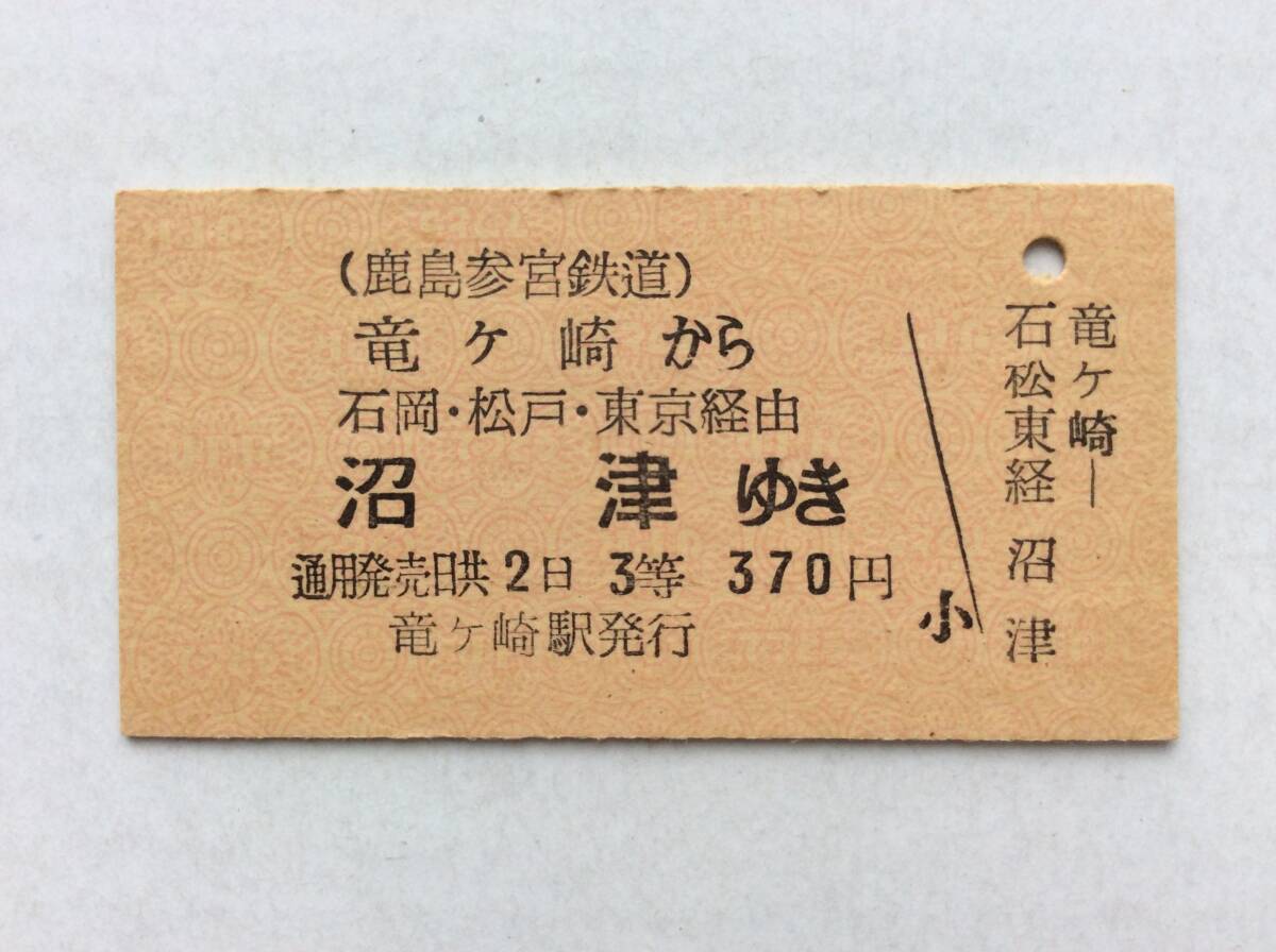 - 鹿島参宮鉄道 国鉄連絡乗車券 竜ヶ崎→沼津 石岡松戸東京経由 3等