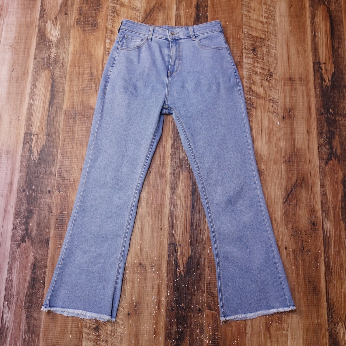 - アースミュージックアンドエコロジー カットオフフレアデニムパンツ レディース ストレッチ 美脚 Mサイズ ライトブルー QH21