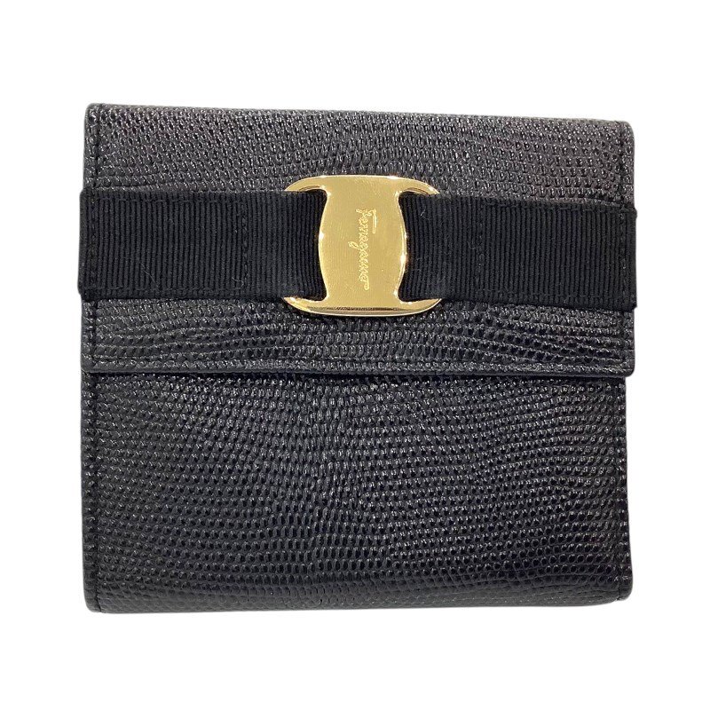 > Salvatore Ferragamo フェラガモ ヴァラリボン リザード 財布 ブラック リザード型押しレザー 【中古】 JA-24194