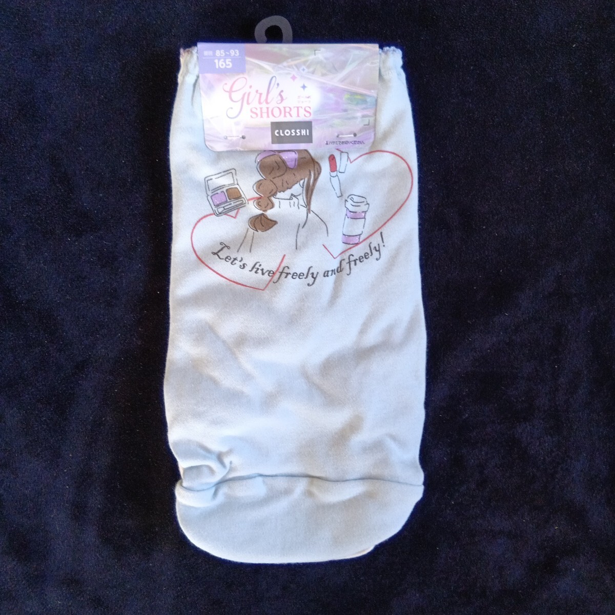 - 女児 ガールズインナー 薄水色地に女の子・コスメ模様&薄クリーム地にリボン・英字模様のショーツ 2枚組 165サイズ