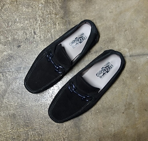 - TK 艶消マットパープルビット金具フェラガモ Salvatore Ferragamo スエードレザー ドライビングシューズ 黒 ブラック 7,5 EEE