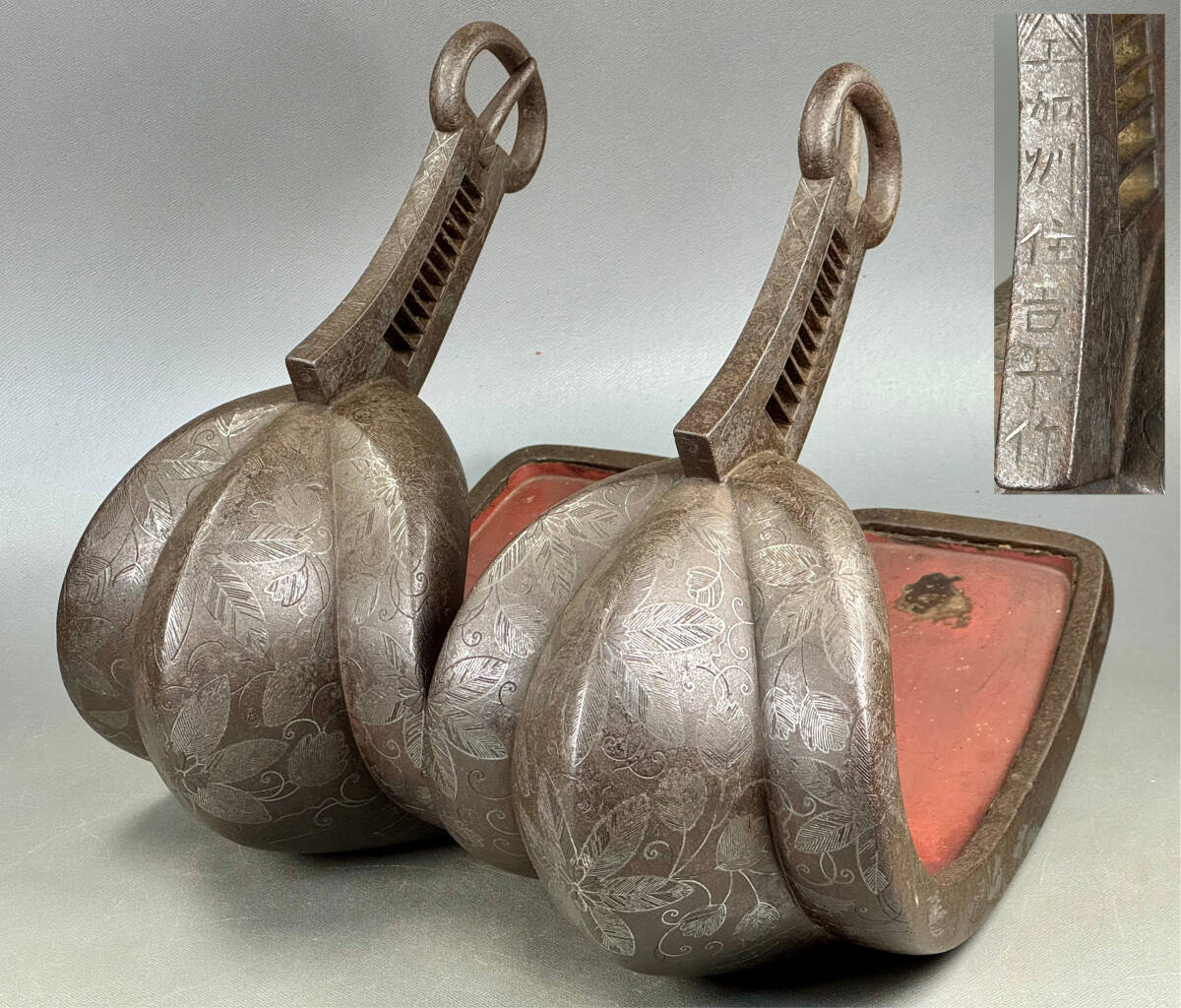 - 【偲】江戸時代 鐙 あぶみ 【加州住吉平作】 極細工 銀象嵌 時代物 鉄製 馬具 一対 武具 r-831