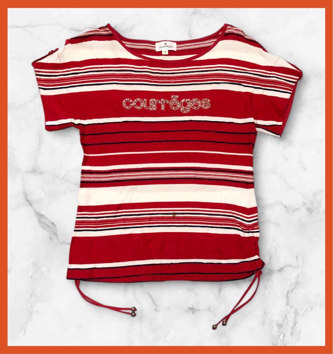 > ◆courreges クレージュ◆ビッグロゴ刺繍 ボーダー柄 半袖 カットソー Tシャツ レッド×ホワイト×ブラック 38