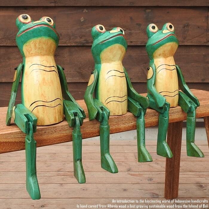 > お座り カエルさん 黄色 Mサイズ ウェルカム人形 蛙 かえる 木製 木彫りの置物 動物インテリア バリ雑貨 アジアン雑貨 動物置物