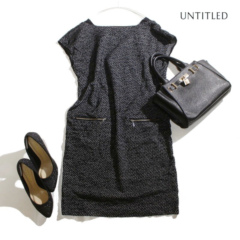 - 美品 アンタイトル UNTITLED 株) ワールド 合物 ジャージ― ニット フレンチスリーブ ミックス ツイードワンピース 0 ブラック 黒 ホワイト