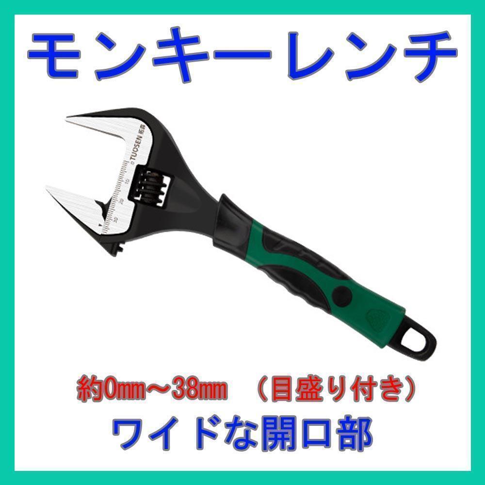 - モンキーレンチ 中型 ワイド 大開口 レンチ 配管 水栓 開口部 目盛り付き 緑