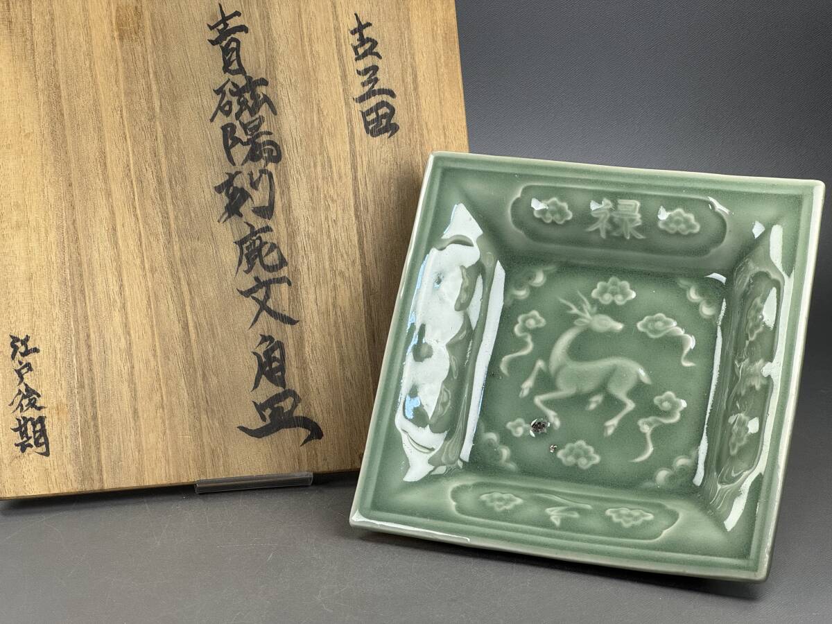 - 【偲】江戸後期 古美術 三田青磁 陽刻 四方大鉢 鹿図 天美禄之 角皿 料亭 懐石 高約4.7㌢ 直径約18.5㌢ 共箱 j-197