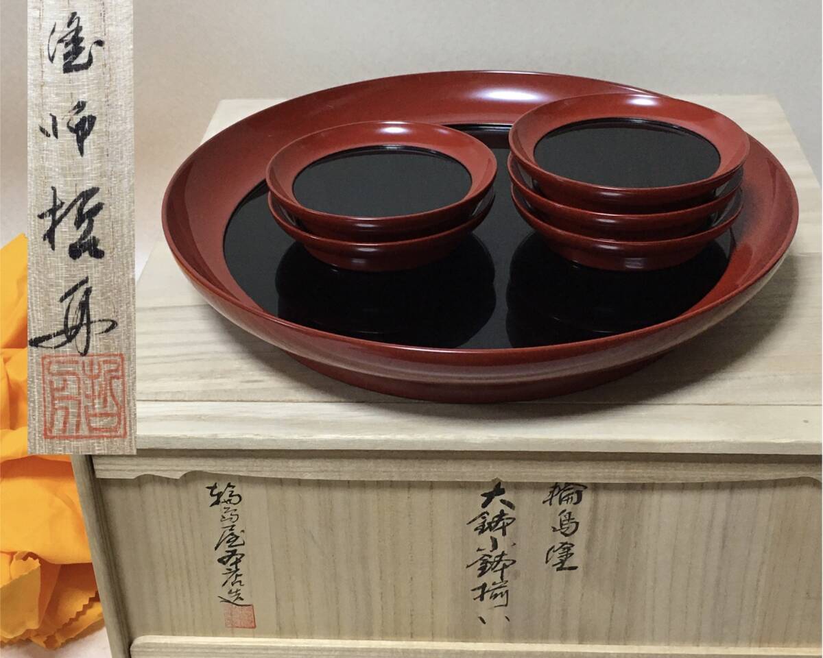 - E656 輪島塗 塗師/哲舟 大鉢/小鉢/揃え 共箱 黄布 輪島屋本店造 お盆 丸盆 菓子盆 小皿 菓子皿