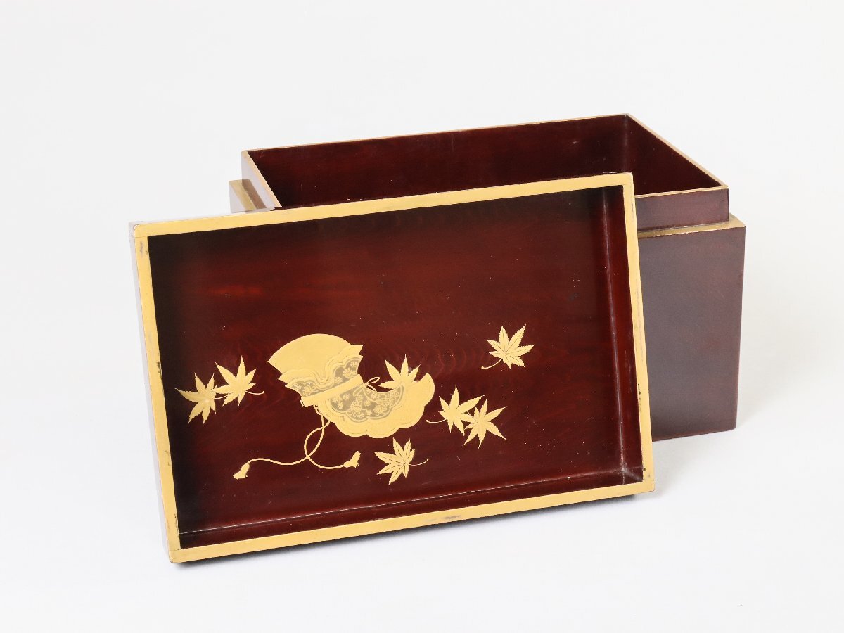 ・蒔絵美術 唐草蒔絵に巾着袋紅葉蒔絵 溜塗 茶箱 仕覆付き 時代箱 /茶道具 漆美術 漆器