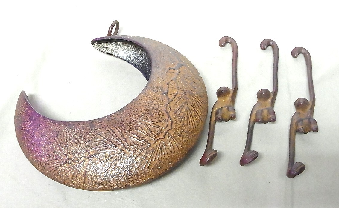 - 南部鉄器 ☆月型 花器 3匹・猿 フック 吊り下げ 鉄器 フラワーベース 生花 ヴィンテージ