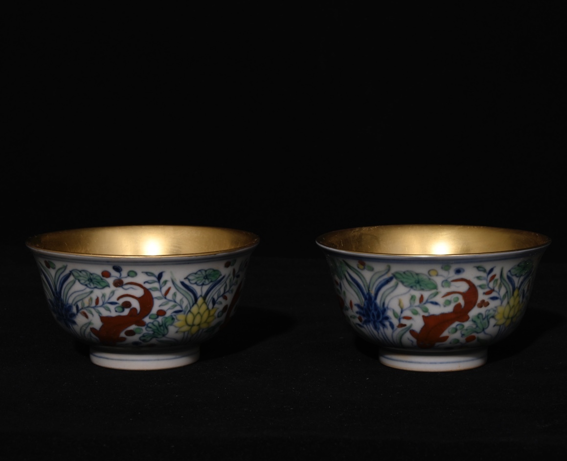 > 9+GV9193「東洋美術」 中国骨董 人間国宝【赤い体のドゥカイ金箔の魚と藻の模様のカップのペア】 旧物 孤品 珍品 陶磁器 収蔵価値が高い