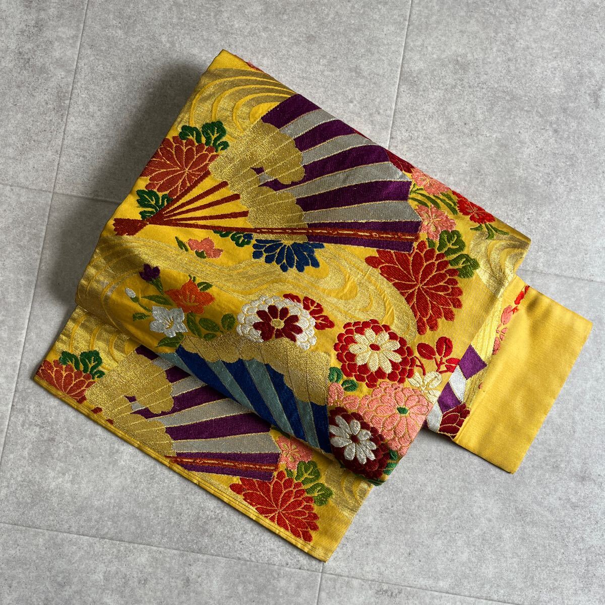 - アンティーク 名古屋帯 着物 黄色 唐織 花 扇 昭和レトロ 大正ロマン モダン 和洋折衷コーデ リメイク け17-06t