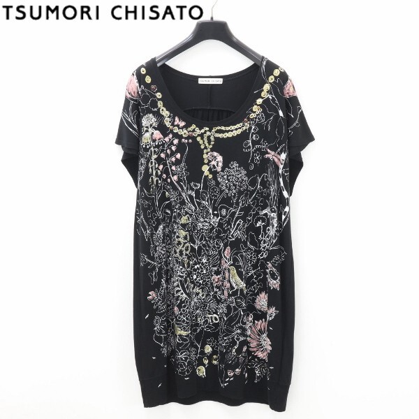> 【KA205】美品◆TSUMORICHISATO ツモリチサト 総柄 プリント 半袖 チュニック ロング カットソー トップス 黒 ブラック 2