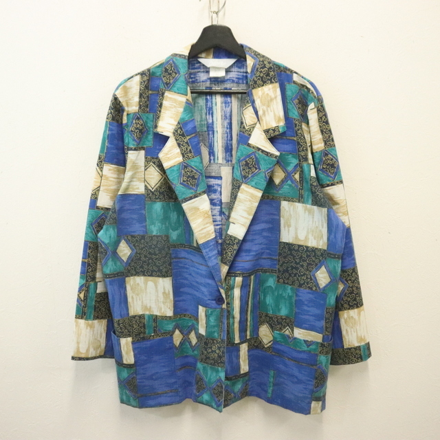 > i596 90sビンテージ Blair テーラードジャケット■1990年代製 XLサイズぐらい レディース ブルー アート ブレザー レーヨン アメカジ 古着