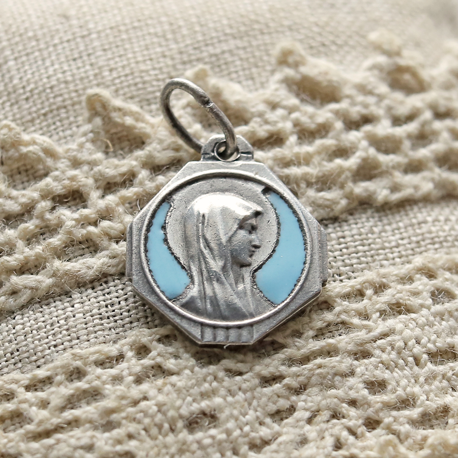 > フランス アンティーク 【ルルドの聖母マリア】水色エナメル メダイ インマキュラータ/LOURDES メダル ロザリオ キリスト 聖母 マリア/F