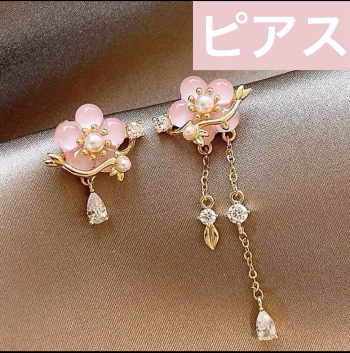 - 春 桜 アシンメトリー ゆらゆら ラインストーン ピアス ゴールド