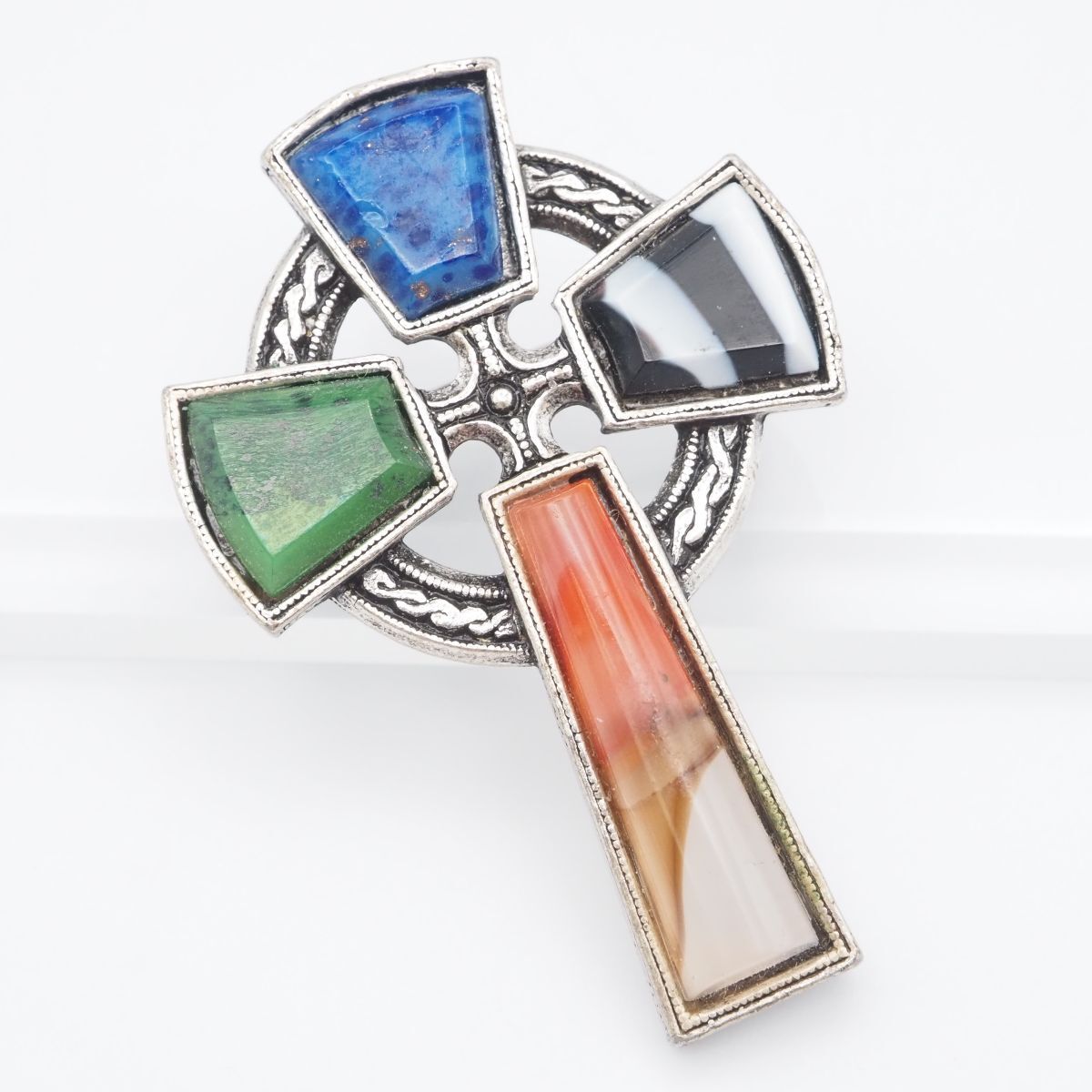 - F355 イギリス ヴィンテージ MIRACLE ミラクル BRITAIN刻印 ブローチ 天然石風 マルチカラー クロス デザイン シルバー 英国 アンティーク