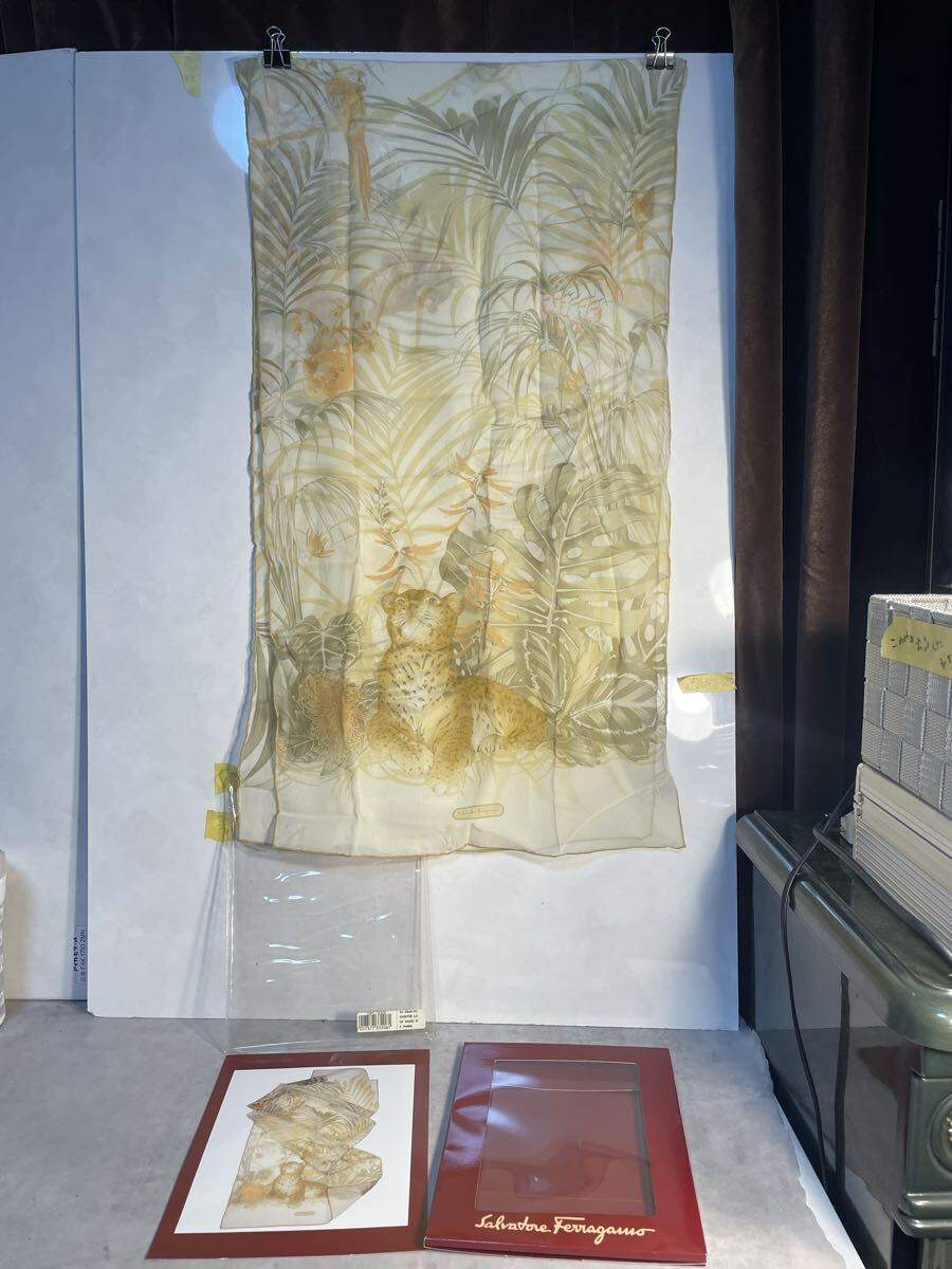 - 希少 未使用級 Salvatore Ferragamo フェラガモ シルク ロングスカーフ 140×40 ジャングル柄 チーター 箱付き
