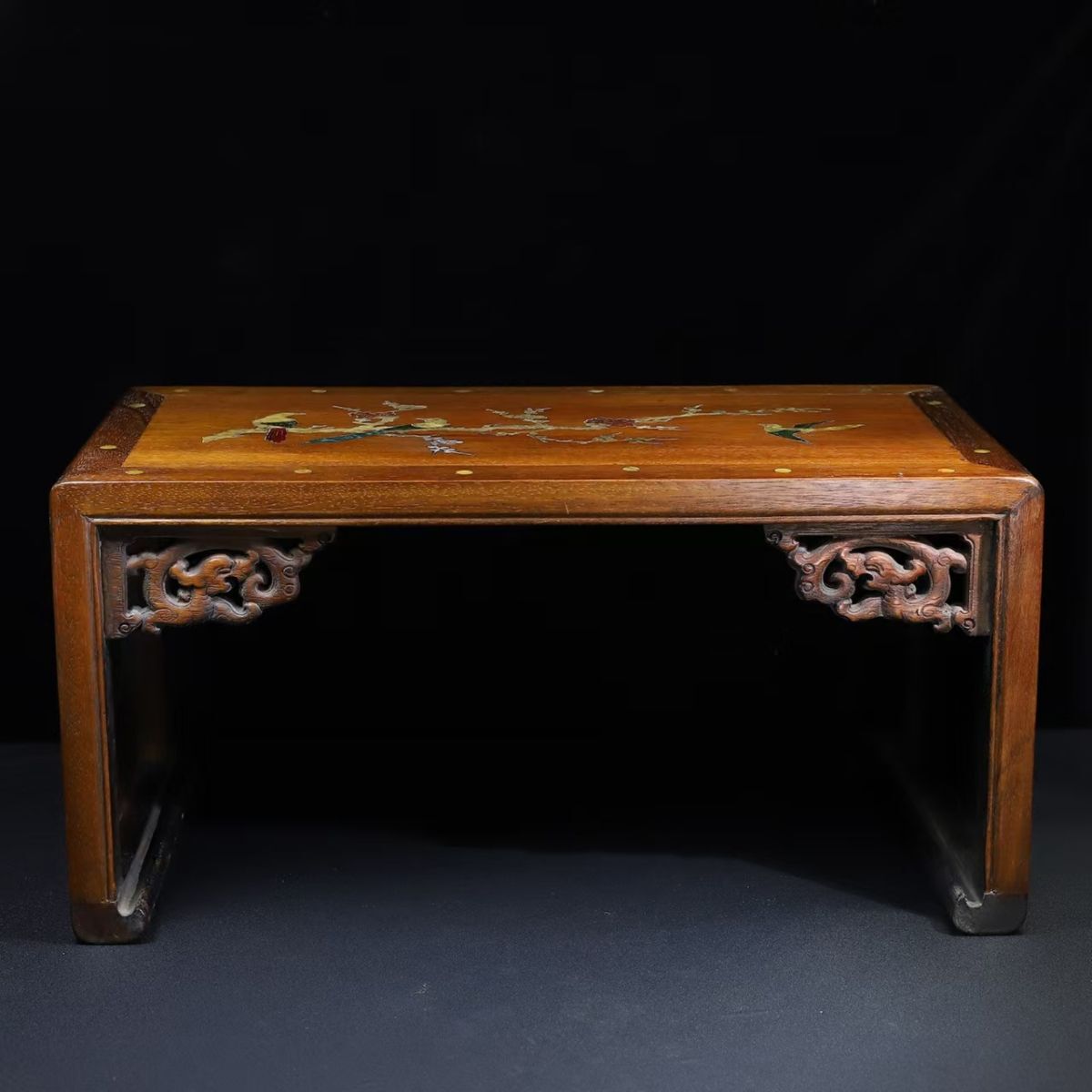- 【美の継承】旧家蔵出 花梨木螺鈿細工花鳥紋平頭案 琴台 茶台 茶道具 置物 木製 手作り 極細工 古玩 中国古美術 時代物 唐物 R07091406