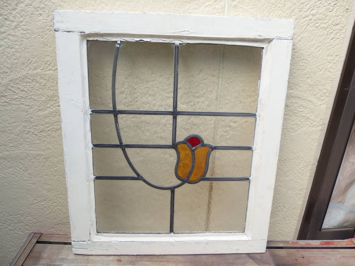 - 12)イギリス アンティーク ステンドグラス 花柄/木枠/フレーム/窓枠